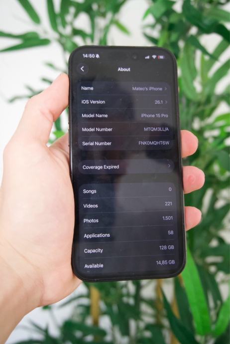 Prodajem iPhone 15 Pro u crnoj, Black Titanium boji s 128 GB pohrane. Nema aposlutno niakvih oštećenja ni ogrebotina, uvijek je bio u maskici i zastitnom staklu koje ima i sada na sebi. Zdravlje baterije je 91% s 390 ciklusa punjenja. Star je niti godinu i pol. Kupljen je u Americi pa podržava samo eSIM. Dolazi uz kutiju, original kabel, a uz nadoplatu migu dati i Apple plavu silikonsku maskicu.