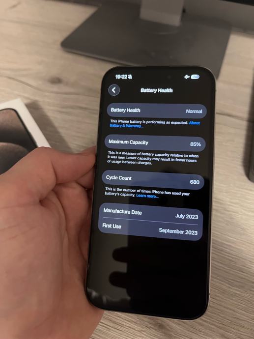 Baterija je na 85% sto je normalno zdravlje baterije nakon 2 godine. Na slikama se vidi i račun od uređaja. Uz mobitel dolazi kutija i kabel za punjenje.