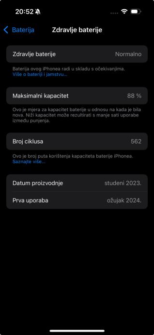 Model sa 256 GB, Black Titanium boja, baterija na 88%. Mobitel je u izvrsnom stanju, bez vidljivih ostecenja.