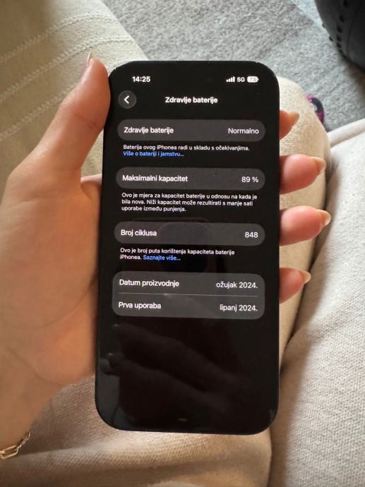 Prodajem iPhone 15 s internom memorijom od 128 GB u crnoj boji. Uređaj je rabljen, ali očuvan. Baterija je u dobrom stanju s maksimalnim kapacitetom od 89%, a telefon je prvi put aktiviran u lipnju 2024. godine.