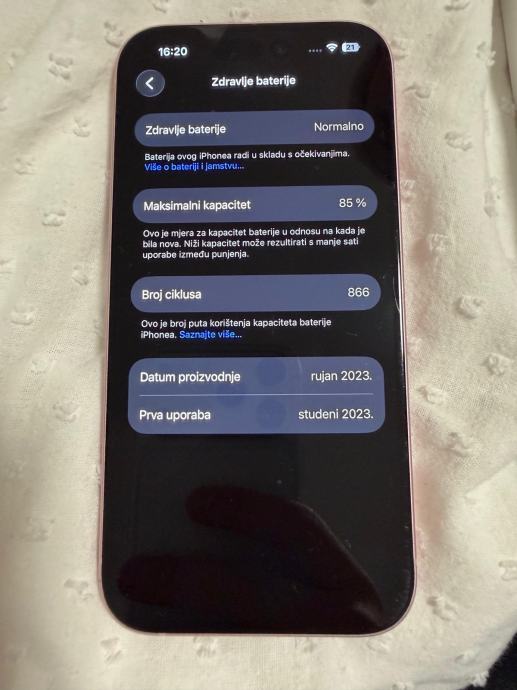iPhone 15 u rozoj boji, kupljen u A1. Uređaj je korišten, ali od prvog dana nošen u maskici. U odličnom stanju.