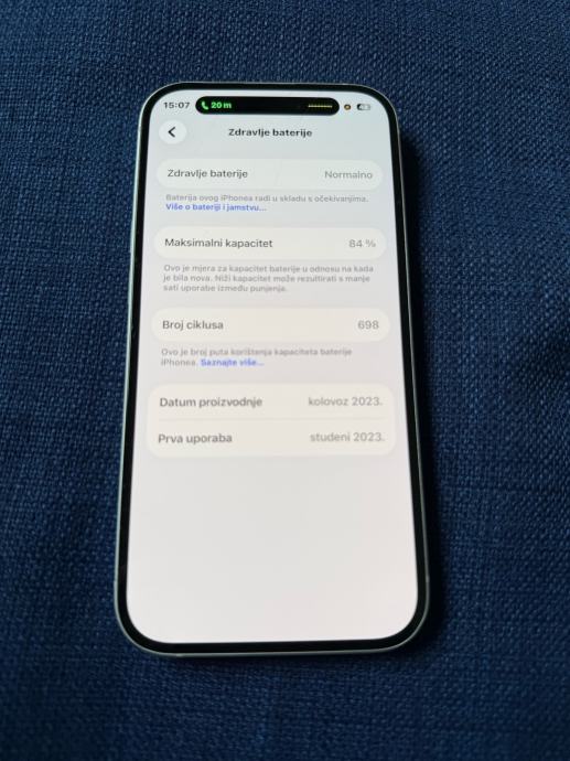 Prodajem iPhone 15 128GB u svijetloplavoj boji. Uređaj je potpuno ispravan, radi kao i prvog dana, a zdravlje baterije je 84% kao što je vidljivo sa slike. Prodajem zbog kupnje novog uređaja. Cijena je spuštena zbog sa slika vidljivih tragova korištenja jer je uređaj često bio nošen bez zaštitne maske. Uz uređaj dolazi originalna kutija sa svim svojim sadržajem.