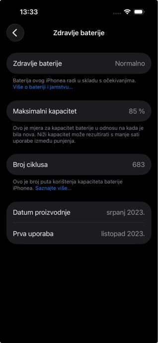 Zdravlje baterije je normalno, s maksimalnim kapacitetom od 85% i 683 ciklusa punjenja.
