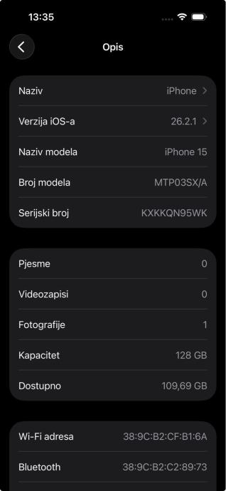 Prodajem rabljeni iPhone 15 u crnoj boji. Uređaj je proizveden u srpnju 2023., a prvi put korišten u listopadu 2023.