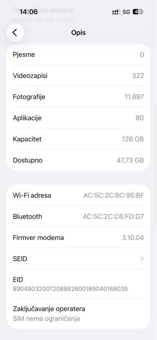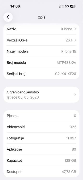 Prodajem iPhone 15 u bijeloj boji, star samo 7 mjeseci i u rabljenom stanju. Uređaj ima kapacitet od 128 GB, a dolazi s iOS verzijom 26.1 i svim originalnim značajkama. Mobitel je očuvan i u potpunosti funkcionalan, idealan za one koji traže noviji model Apple telefona po povoljnijoj cijeni. Drzan stalno u zelenoj maskici, uz telefon dajem i punjac.
