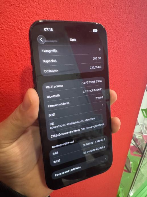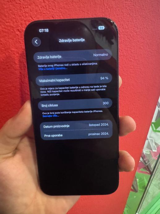 Prodajem iPhone 16 Pro Max s 256 GB memorije, crne boje. Baterija je na 94% kapaciteta. Telefon je u rabljenom stanju, potpuno funkcionalan i bez problema. Dolazi s 300 ciklusa punjenja, prvo korištenje zabilježeno u prosincu 2024.