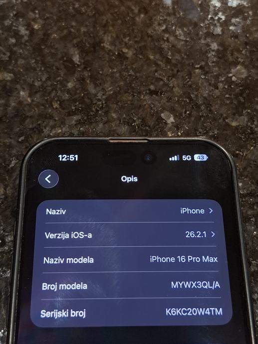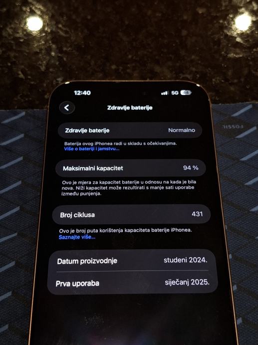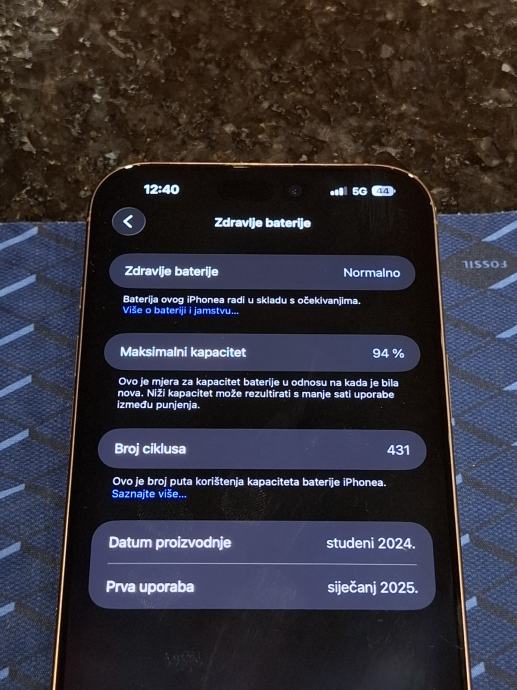Prodajem iPhone 16 Pro Max sa 256 GB memorije u Desert Titanium boji. Telefon je u odličnom stanju i potpuno ispravan. Radi se o Pro Max modelu s vrhunskim performansama, trostrukim kamerama i titanijskim okvirom. Baterija je u izvrsnom stanju s maksimalnim kapacitetom od 94%, što znači da telefon drži bateriju gotovo kao novi. Datum proizvodnje je studeni 2024., a prva uporaba je zabilježena u siječnju 2025., što potvrđuje da je uređaj relativno svjež. Telefon ima 431 ciklus punjenja. Uključena je maskica magsafe koja podržava bežično punjenje te kabel za punjač. Kutija, papiri i račun.