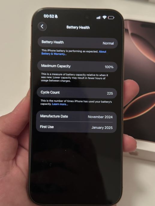 Pohrana je 256GB te na dan 21.08. i dalje ima 100% zdravlje baterije. Na njemu je trenutno iOS 26 beta, no budem ga resetirao ako zelite na iOS 18. Garancija mu vrijedi do 08.01.2026. Kupljen u iStyleu. Uz mobitel se dobije kutija, račun, kabel za punjenje.