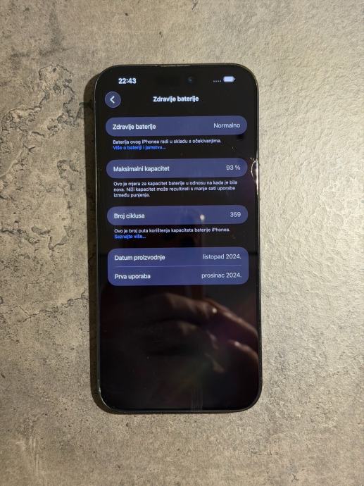 Zdravlje baterije je na 93% kapaciteta sve na uređaju je ispravno te nikada ništa nije popravljano ili mijenjano.