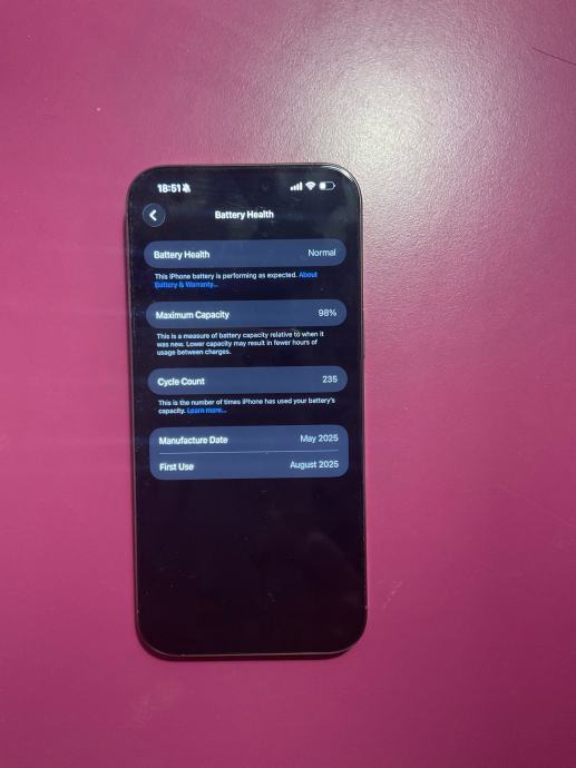 Mobitel je prvi put koristen u kolovozu, zdravlje baterije je na 98% br. Ciklusa je vidljiv u slikama. Mobitel ima garanciju do kolovoza te je u novom stanju bez ikakvih ostecenja i jako malo koristen. Cijena nije fiksna i zamjenu prihvacam samo ako je u pitanju Iphone 17 Pro Max uz nadoplatu