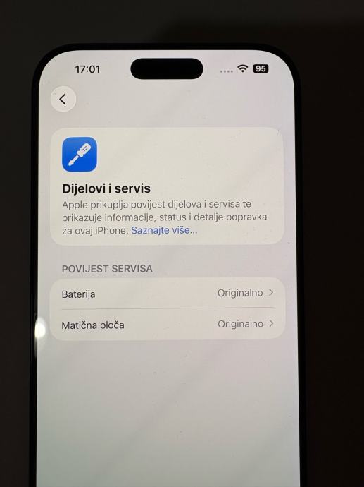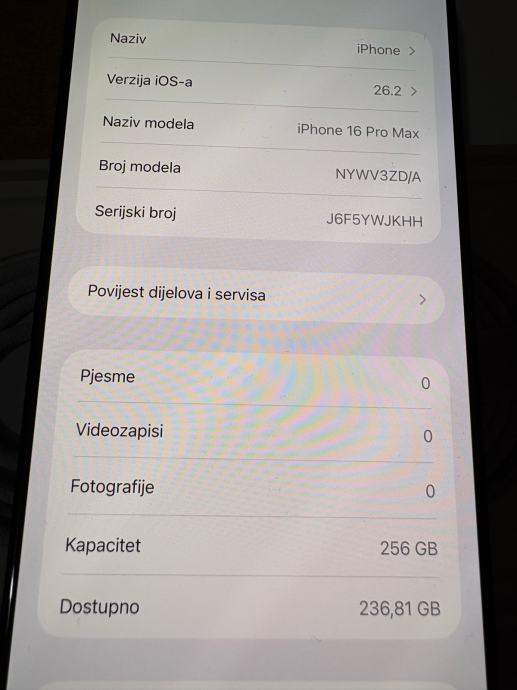Prodajem iPhone 16 Pro Max s 256 GB memorije u sivoj boji (Black Titanium). Telefon kupljen u A1 6/2015 bio na servisu sa opisom kvara “ugasio se”Prema povijesti servisa vidljivoj u postavkama, baterija i matična ploča su promjenjene vidljivo iz slika . Garancija vrijedi do 6/2026