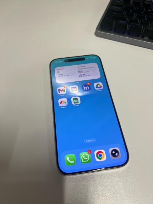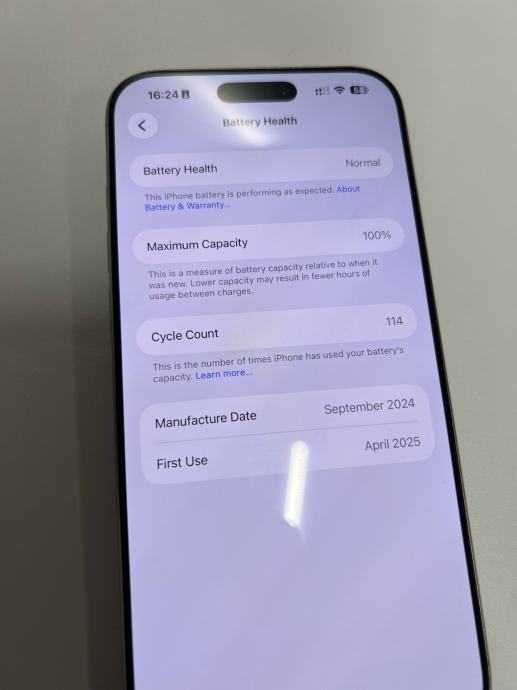 Prodajem iPhone 16 Pro Max s 256 GB memorije u sivoj boji. Baterija je na 100% kapaciteta s ukupno 114 ciklusa punjenja, a datum prve upotrebe je travanj 2025. Uređaj radi besprijekorno ima malu crticu na ekranu koja se vidi na slikama kada je ekran ugasen