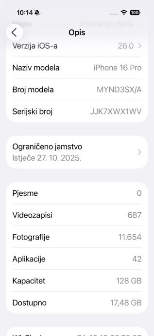 Prodajem iphone 16 pro crni 128gb. mobitel je korišten 100% ispravan, zdravlje baterije 98%, racun.