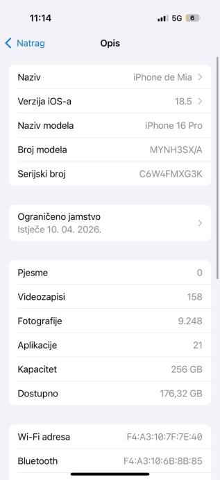 iPhone 16 pro 258 mobitel u odličnom stanju crni s garancijom
