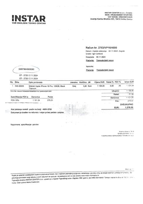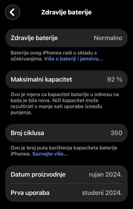 Prodajem iPhone 16 Pro 128 GB boja Black Titanium - iOS 26.2.1. Kupljen u Instaru 5.11.2024., garancija je istekla. Zdravlje baterije 92% - 350 ciklusa. Mobitel je ispravnan 100% - sve radi i prihvaća sve mobitlne mreže SIM + eSim (dual sim). Stanje 10/10 nema tragova korištenja, od prvog dana u zaštitnoj maskici i sa zaštitnim staklom. Original kutija + kabel za punjenje + 4 zaštitnih maskica + 3 nova zaštitna stakla.