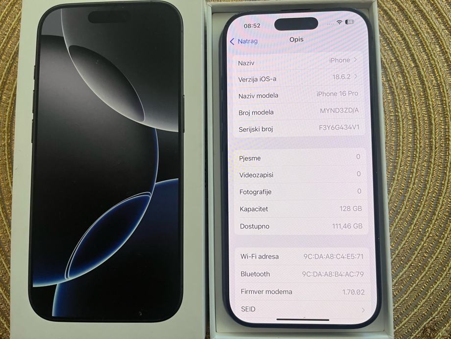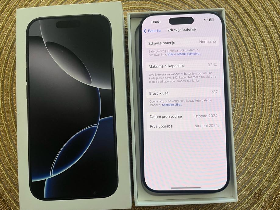 Prodajem korišteni 16 Pro 128gb u crnoj boji. Zdravlje baterije je 91%. Jamstvo je isteklo. Uz mobitel dolazi kutija , kabel i maskica.