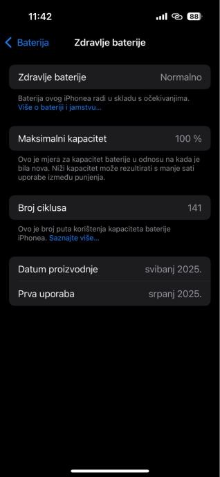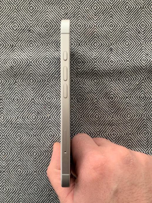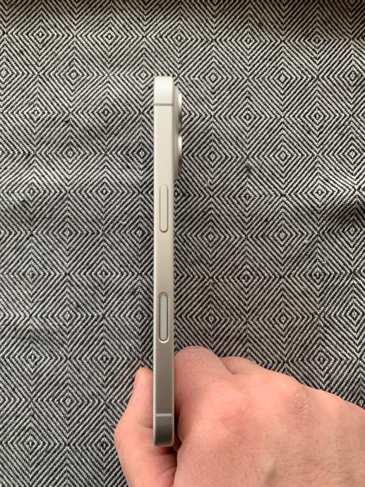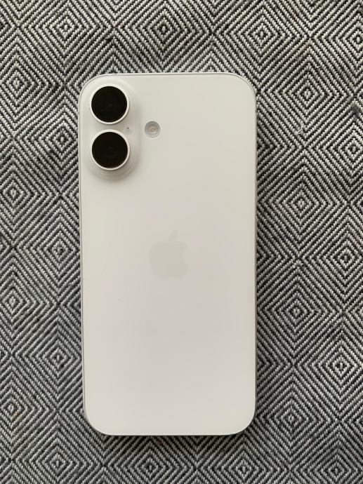 Prodajem iPhone 16 bijele boje sa 128 GB memorije. Telefon je rabljen, ali u dobrom stanju. Baterija je na 100% kapaciteta, a datum proizvodnje je svibanj 2025. Telefon dolazi s karakterističnim dizajnom iPhone 16 serije s dva objektiva na stražnjoj strani.