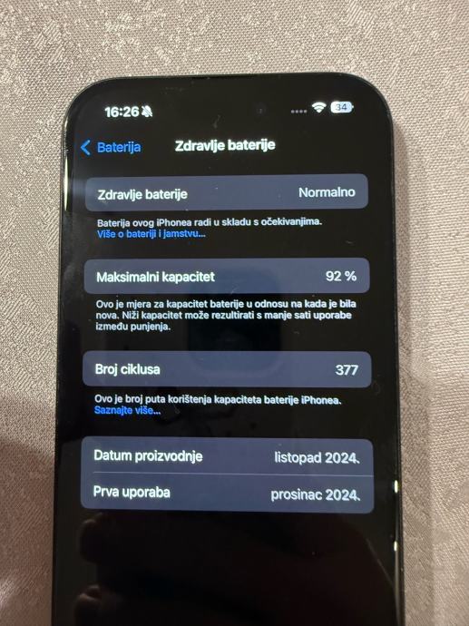 Prodajem rabljeni iPhone 16 u crnoj boji s kapacitetom memorije od 128 GB. Mobitel je u dobrom stanju s normalnim zdravljem baterije od 92%. Uređaj je vrlo malo korišten i ima samo 377 ciklusa punjenja baterije.