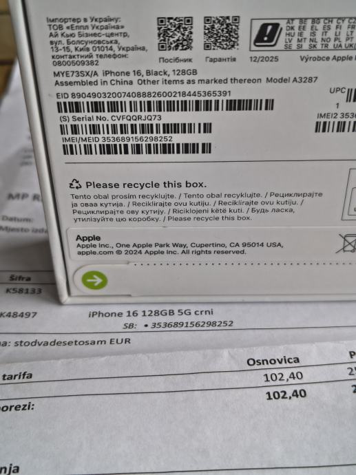 Iphone 16 128GB Black Novo Zapakirano Garancija