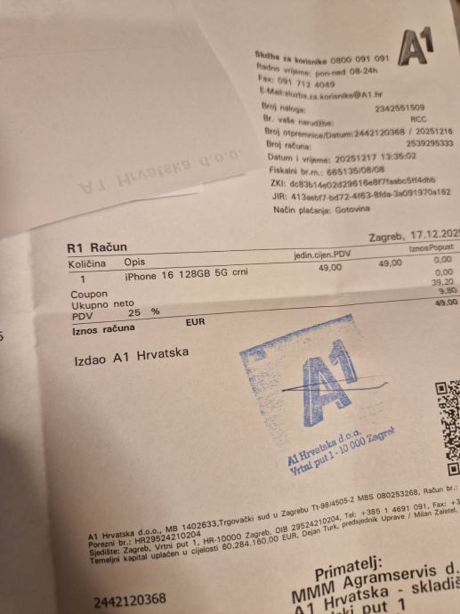 Uz mobitel ide RAČUN iz ducana gdje kupljen u HR., koji je ujedno dokaz za garanciju koju ima 2 godine.