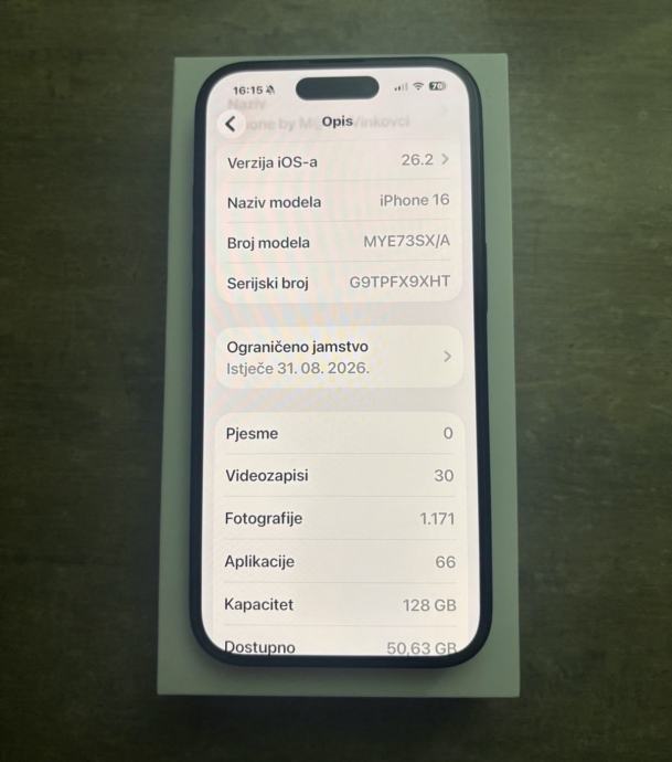 Prodajem iPhone 16 s 128GB memorije u crnoj boji, star tek tri mjeseca (račun + garancija). Uređaj je kao nov i bez ikakvih oštećenja, s dvostrukim kamerama na stražnjoj strani. Mobitel dolazi u originalnoj ambalažu sa svim pripadajućim dodacima. Maskica i punjač uključeni u cijenu.