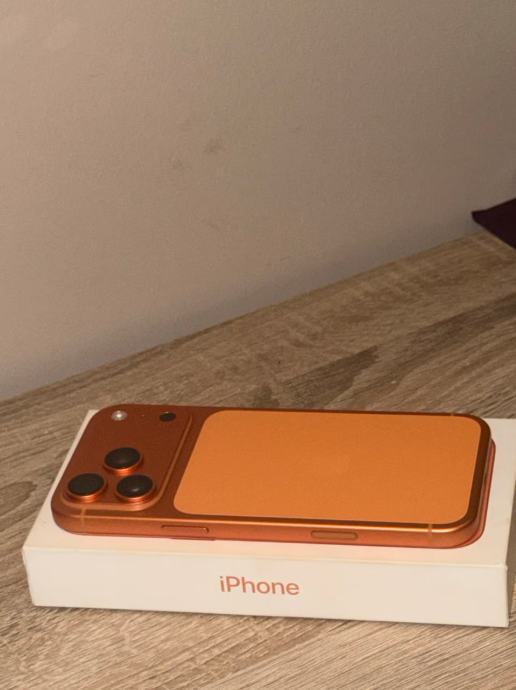 Apple iPhone 17 Pro Max s 512 GB prostora za pohranu. Telefon ima narančasti okvir i stražnju stranu. Ima više kamera na stražnjoj strani i USB-C priključak na dnu. Dolazi u originalnoj kutiji, kao što je prikazano na fotografijama. Idealan je za korisnike kojima je potreban veliki kapacitet pohrane za aplikacije, fotografije, videozapise i ostale datoteke.