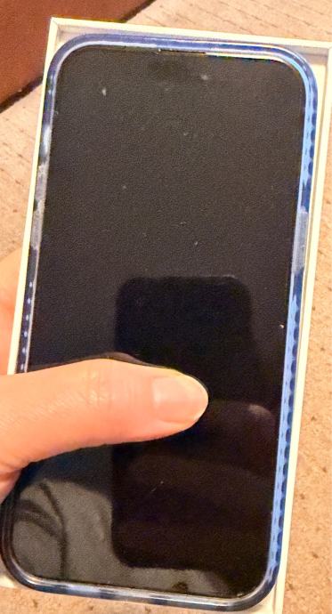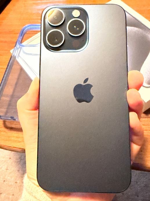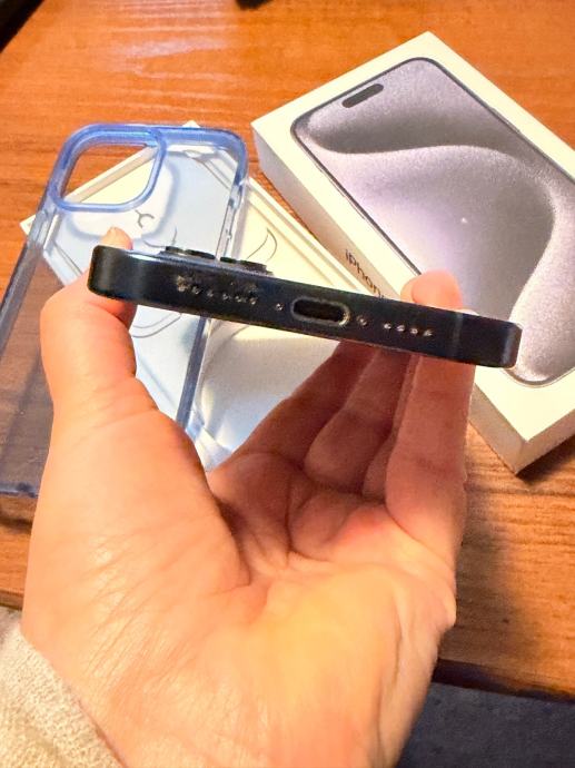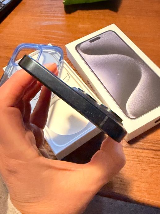 iPhone 15 Pro max, bez ogrebotine, sa zaštitnim staklom, plavom prozirnom maskicom i kutijom.