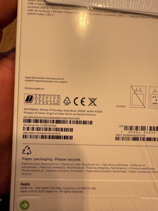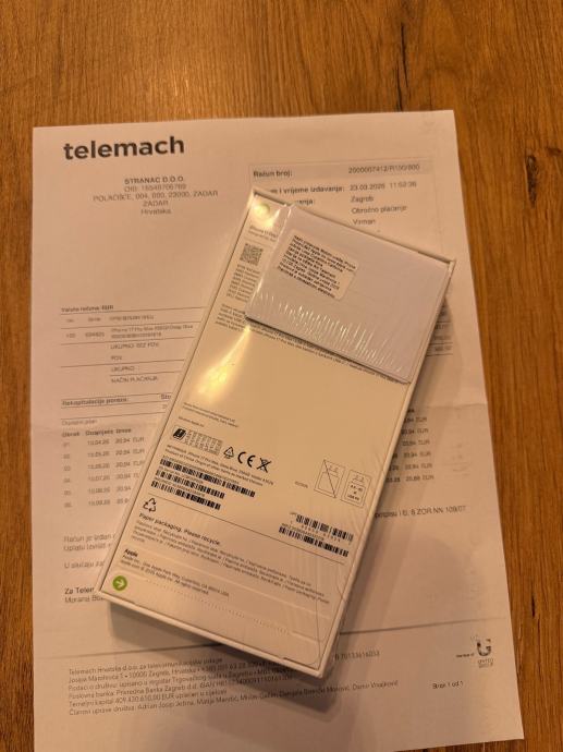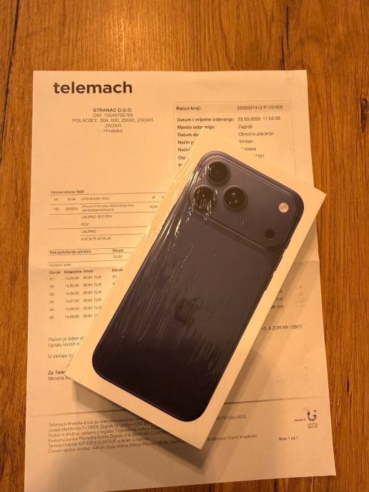 Prodajem nov iPhone 17 Pro Max s 256 GB memorije u boji Deep Blue (duboko plava). Uređaj je tvornički zapakiran i dolazi s originalnim Telemach računom.