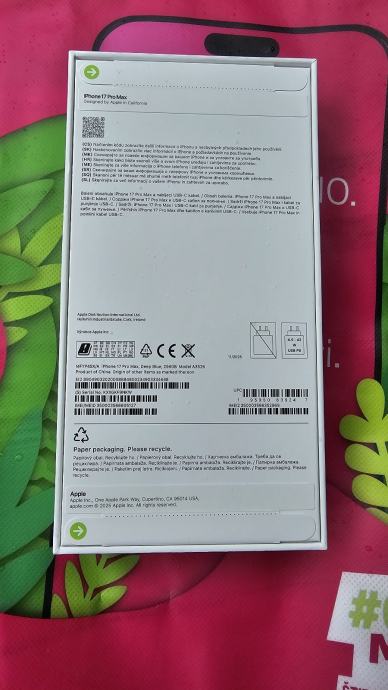 Potpuno novi iPhone 17 Pro Max, 256 GB, deep blue boja. Kupljen 26.01.2026., racun tmobile.