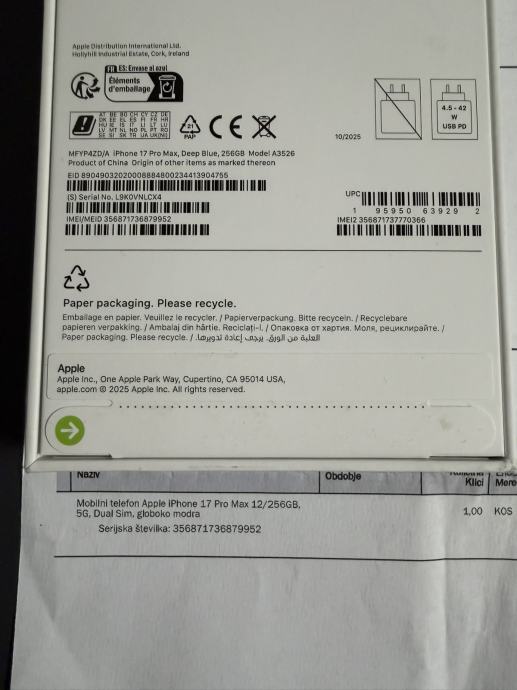 Prodajem novi, original zapakiran iPhone 17 Pro Max 256Gb, boje Deep Blue