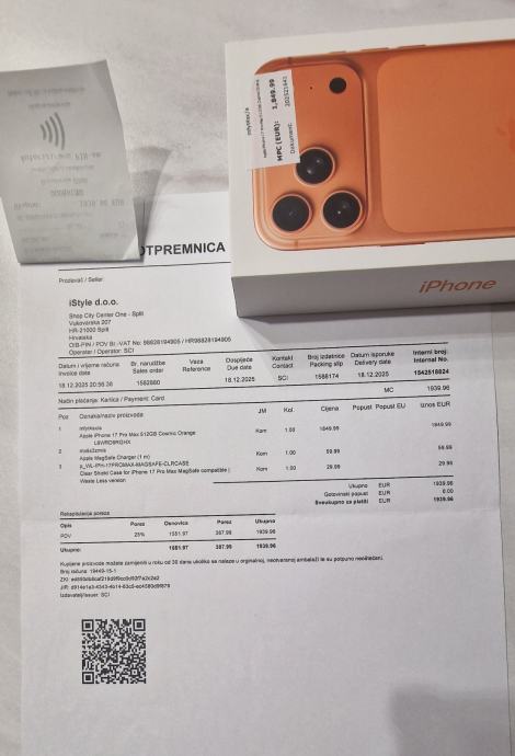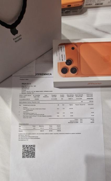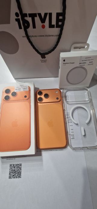Prodajem Novi Apple iPhone 17 Pro Max 512GB Cosmic Orange s MagSafe punjacem i odgovarajucom maskom za bezicno punjenje (prozirna). Uredaj je kupljen 18.12.2025 u iSTYLE u Splitu. Uredaj je u odlicnom stanju i 100% ispravan s garancijom od 24 mjeseca od dana kupnje. Ukupna cijena racuna je bila 1.939,96 EUR (mob 1.849,99 EUR + punjac 59,99 EUR + maska 29,98 EUR). Prodaje se jer se ne mogu naviknuti na iPhone nakon dugogodisnjeg koristenja Android mobitela, te cu se vratiti na Android. Na zalost mi ne odgovara iako je mobitel predivan i odlicne kvalitete te se nadam da ce pronaci novog vlasnika koji ce uzivati koristeci ga.