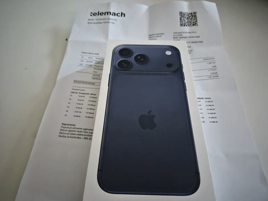 Apple iphone 17 pro max plavi,račun i jamstvo.Kupljen na produljenje pretplate,ide na sve mreže.Novi i nekorišten.Ne šaljem poštom,samo osobno preuzimanje.Kontakt poziv,sms,viber,whatsapp 099-668/6069