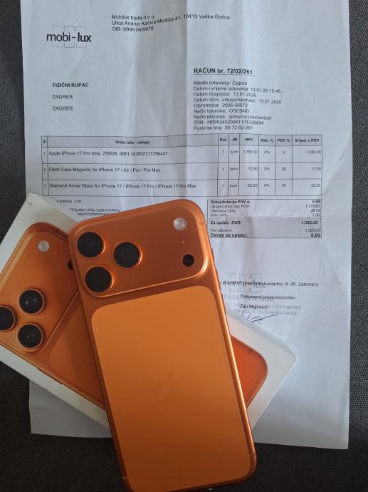 Iphone 17 pro max 256gb Orange kupljen 13.1.2026 u slobodnoj prodaji.