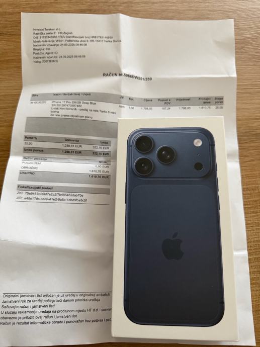 Prodajem rabljeni iPhone 17 Pro s 256 GB memorije u boji duboko plava. Dolazi s originalnom kutijom i računom.