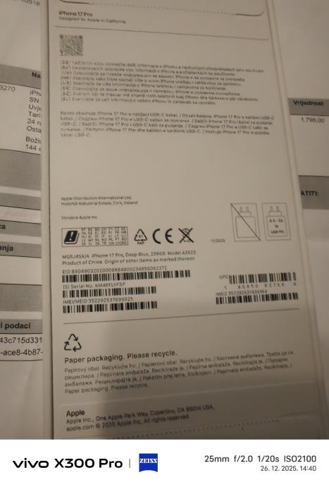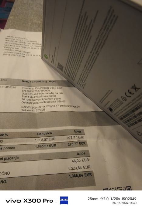 Iphone 17 PRO 256GB..uređaj potpuno novi u vakumu..racun iz T-coma koji mu je ujedno i garancija 24 mjeseca od dana aktiviranja mobitela..dobiven je na produzenje ugovora ali kao sto vidite po slikama koristim Vivo x300 Pro i ovaj je višak..cijena je ta koja je navedena i nije moguce ju korigirati..molim bez ponuda nudim toliko cijesćna je takva kakva je..1300e FIKSNA..u zamijeni je cijena 1350e isključivo uz drugi mobitel uz realnu nadoplatu....kontakt broj je 097/665/0442..odg na sve upite ali ne saljem postom...ugodne blagdane..