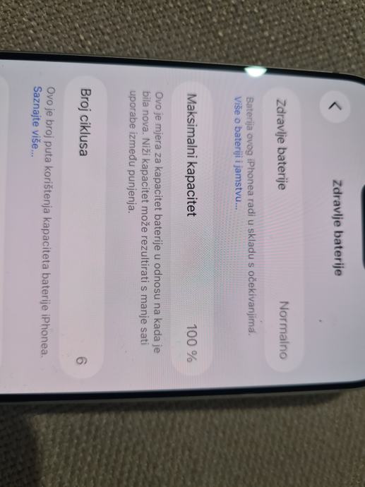 Korišten samo za razgovore, ima 6 cikusa punjenja, zdravlja baterije je na 100% stanje NOVO.
