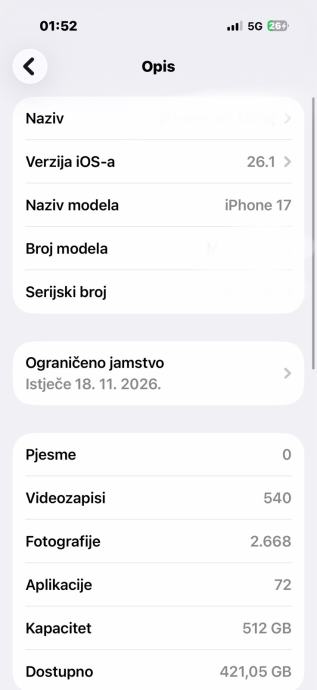 Iphone 17 512 gb u savrsenom stanju bez ogrebotina sa kutijom i garancijom. Zdravlje baterije 100%
