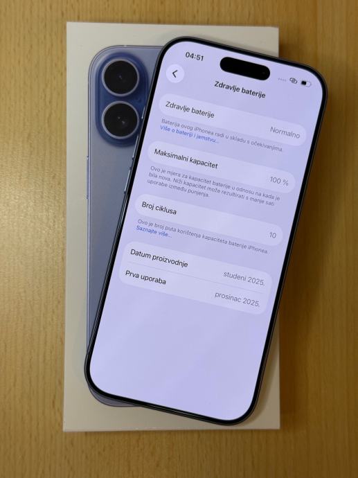 Uređaj je korišten jedva 2 tjedna, što je jasno vidljivo po računu, zdravlju baterije koje iznosi 100% te po samo 10 ciklusa punjenja.