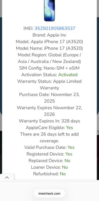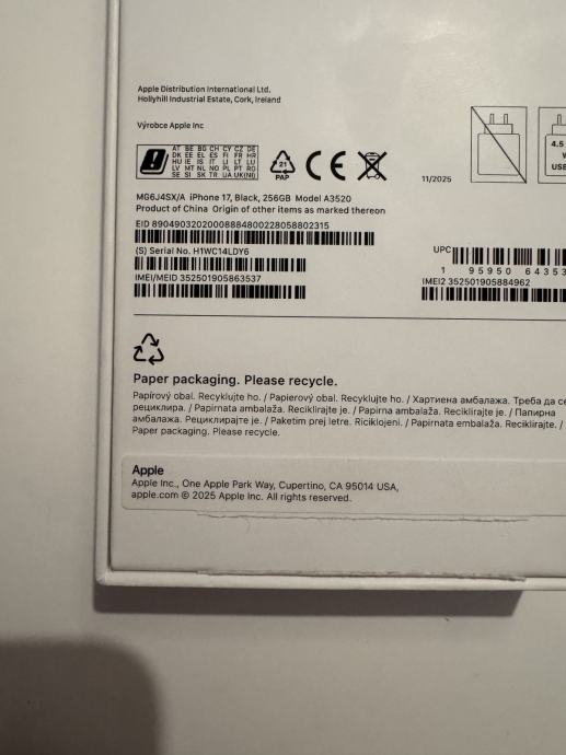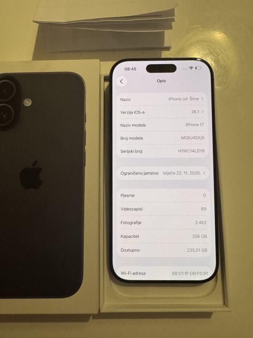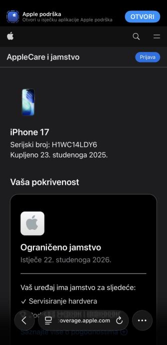 Prodajem IPHONE 17 256GB BLACK STAR MJESEC DANA, KAO NOV! Prekrasne crne elegantne boje. Mobitel je doslovno kao nov, bez iti jedne ogrebotinice. Od prvog dana u maskici, kaljeno staklo na ekranu i zaštita na kamerama. Baterija je na 100% , samo 41 ciklus punjenja. Mobitel se ne koristi i spremljen je. Uz mobitel ide originalna kutija, kabel (neotvoreni) za punjenje, račun i gratis maskica, kaljeno staklo na ekranu i zaštita na kamerama. MOBITEL IMA RAČUN I GARANCIJU-JAMSTVO. Ima tvorničko jamstvo od APPLE-a za Hrvatsku, cijelu Europu i svijet (za sve ovlaštene-licencirane servise-trgovine od Apple-a) do 22.12.2026.godine, globalno Apple-ovo jamstvo. U galeriji slika od oglasa se nalaze slike kutije od mobitela gdje se vide IMEI i serijski broj od mobitela. MOBITEL JE KAO NOV! ODMAH DOSTUPAN! Otključan za sve mreže. Bez zamjena. Zadar. Najbolje osobno preuzimanje ako se može (možemo se dogovoriti), ako ne, po dogovoru s kupcem mogu poslati gdje treba, može i pouzećem. Kupac plaća poštarinu.