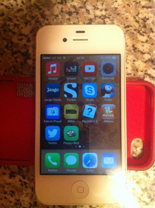Star skoro dvije godine, lock tipka (za zajljucavanje) je blokirana, pa se ne moze zakljucati kada se ta tipka stisne, nego se automatski zakljucava nakon 1min ne koristenja. Instaliran iOS 7.1. Ima ostecenja po ovom plasticnom rubu izmedju aluminija i stakla, staklo u savrsenom stanju, niti ogrebotine zbog koristenja folije i nosenja silikonske maske. Cijena je niska zbog toga sto ga se zelim sto prije rijesiti, i sto popravak lock tipke dodje 200kn (provjereno u servisu). Od opreme ima sve kao i novi, osim sto je data kabel novi, crne boje. Slusalice su originalne, potpuno ispravne. Uz njega idu crvena kozna futrola na preklop, bijela i crna silikonska maska i crvena na bijele tocke maska. Radi na HT-HR mrezu (098,099,097).