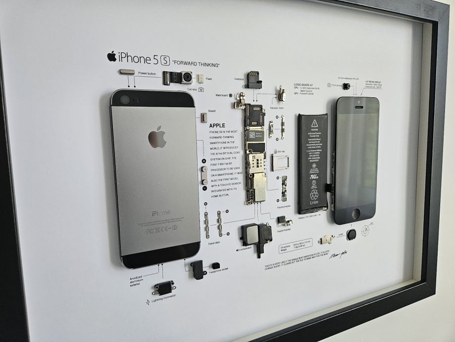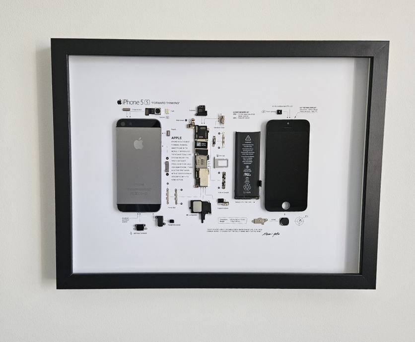 Predstavljam ti iPhone 5s koji je prošao – doslovno – kroz ruke stručnjaka za rastavljanje (čitaj: mene)! Svaka sitnica, od home buttona do posljednjeg vijka, uredno je složena na A3 papir i označena da i tvoja baka zna što je što :D Sve to u elegantnom crnom okviru koji će tvoj zid pretvoriti u pravu Apple galeriju.