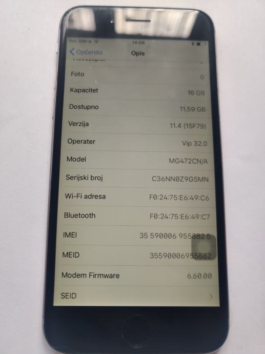 iPhone 6 16 GB, sve mreže, zdravlje bat.90 posto,hom tipka ne radi