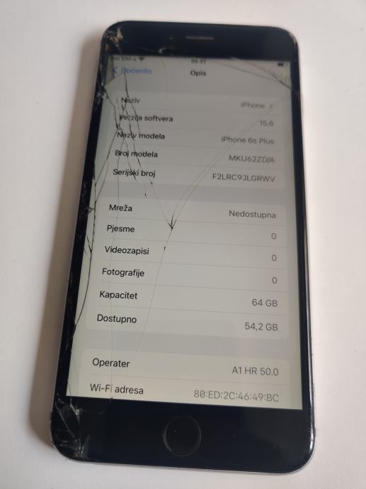 iPhone 6S Plus,64 GB, bez punjača -baterija 93 posto-oštećen ali radi