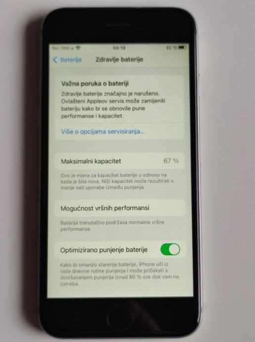 Potpuno ispravan, radi bez štekanja, baterija slaba na 67% zdravlja. IOS 15.8.5. Memorija 64.gb. Sve mreže, samo mobitel bez dodataka. Nisam za zamjene, preferiram osobno preuzimanje, poštom šaljem isključivo uz uplatu na račun, proizvod + poštarina.