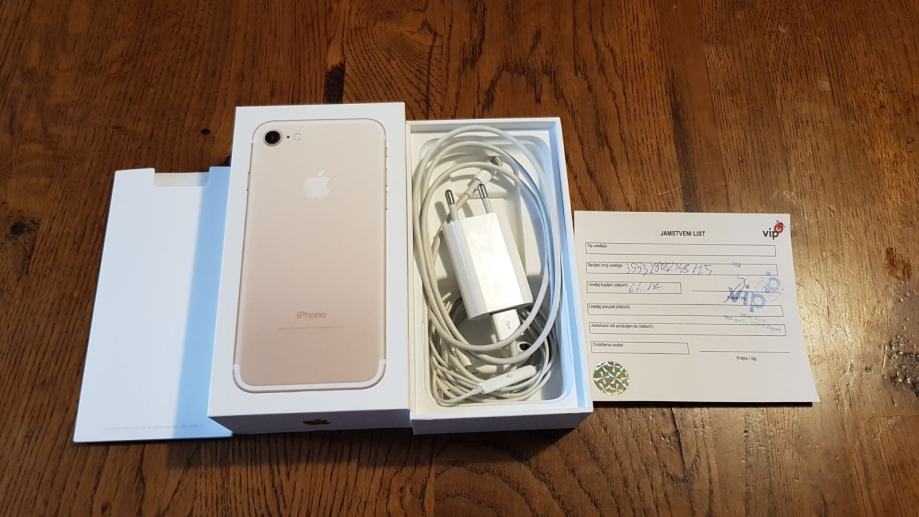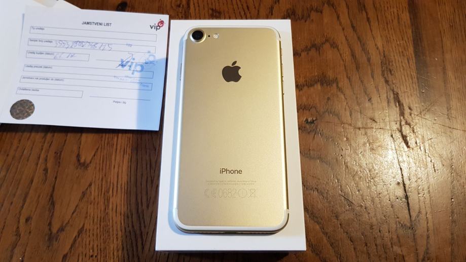 Prodajem iphone 7 128gb zlatne boje. Kupljen je u vipu 6.6.2017. Pod garancijom jos nesto vise od 8 mjeseci. Mobitel je od prvog dana koristen sa maskom i kaljenim staklom na okviru ima dvije pikice koje su nastale preko maske (slika u prilog, vidi se da je maska ostecena na istom mijesu gdje i mobitel) osim te dvije pikice na sebi nema apsolutno nijednu crticu. Ekran bez ijedne crtice jer je gore kaljeno staklo. Mobitel radi na sve mreze te uz njega ide sva oprema. Na slikama se jasno vidi stanje mobitela, garancija te sva oprema.