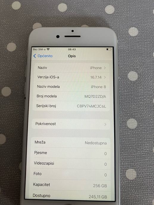 Prodajem iPhone 8 - 256 GB memorije u bijeloj (silver) boji. Uređaj radi, zdravlje baterije pokazuje 100% ali se napuhnula, vidi se i na slici da je istisnula display van. Na uređaju je instaliran iOS 16.7.14. Uz njega dolazi kabel za punjenje i slušalice, kutiju nemam.