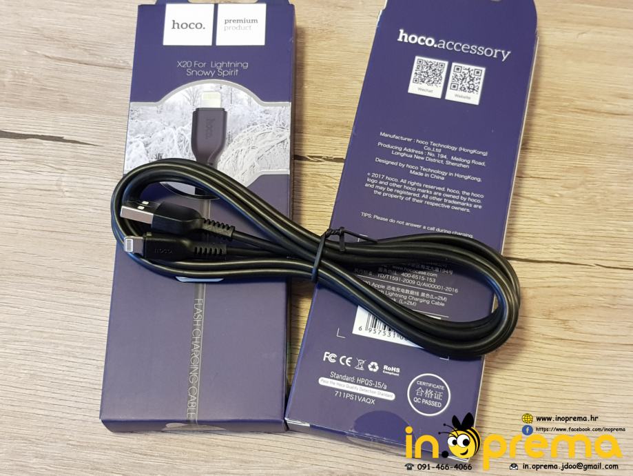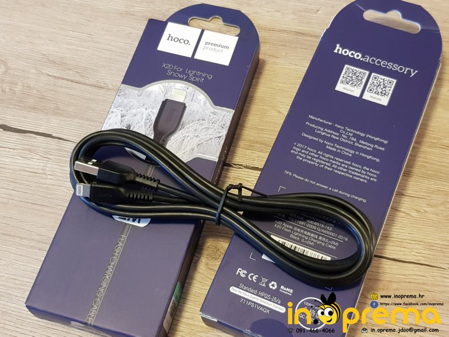 Kabel služi za prijenos podataka i punjenje iPhone 5/6/7/8/X te iPad uređaja koji imaju lightning ulaz. Kabel se kombinira sa zidnim adapterom. Kabel certificiran od strane Apple-a. HOCO je premium brend visokokvalitetne elektronike.KARAKTERISTIKE: - dužina: 2m - 5V/2A