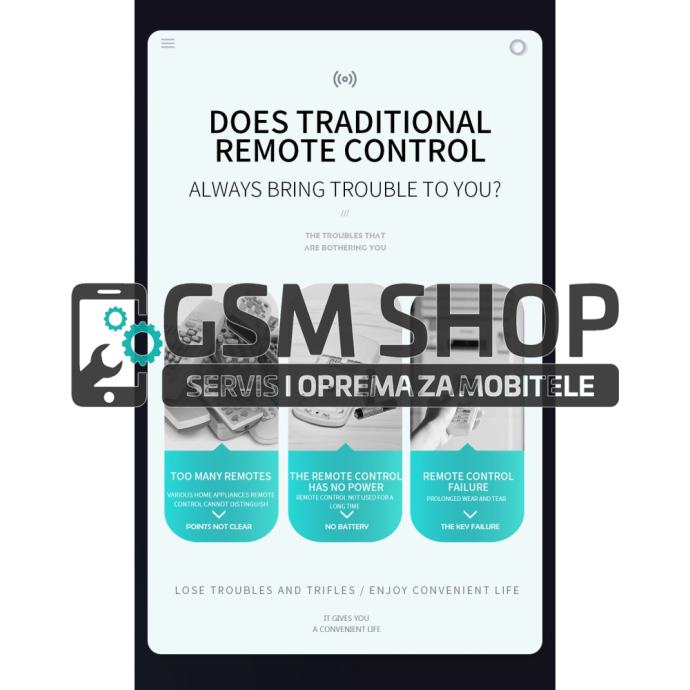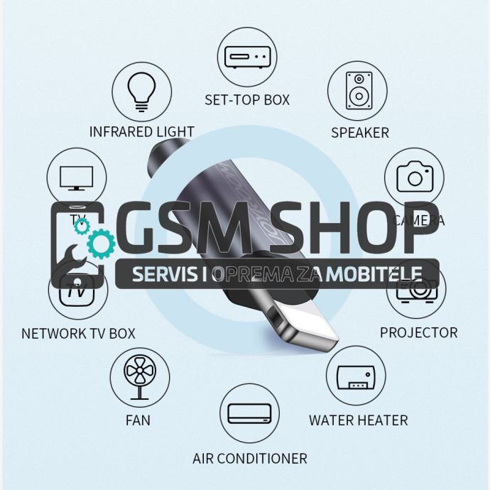 * Pretvara mobilni telefon u univerzalni daljinski upravljač za kontrolu svi kućanskih uređaja na daljinsko upravljanje
