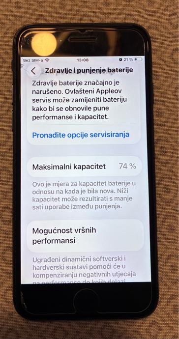 Prodajem iPhone SE 2. generacije u crnoj boji 128GB. Telefon je potpuno ispravan i sve funkcije rade kako treba. Kapacitet baterije je na 74% maksimalnog kapaciteta. Stražnja strana ima puknutinu na staklu, ali to ne utječe na funkcionalnost uređaja.