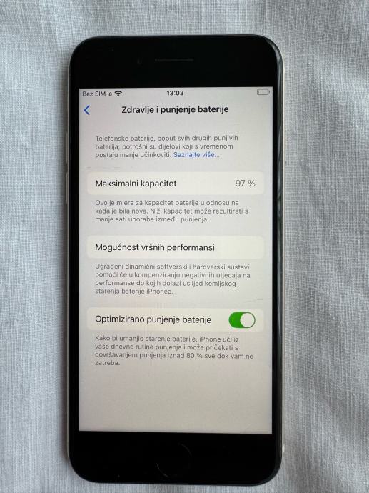 Prodajem rabljeni iPhone SE 2022 s 64GB memorije u odličnom stanju. Uređaj je potpuno funkcionalan i ima bateriju s kapacitetom od 97%.